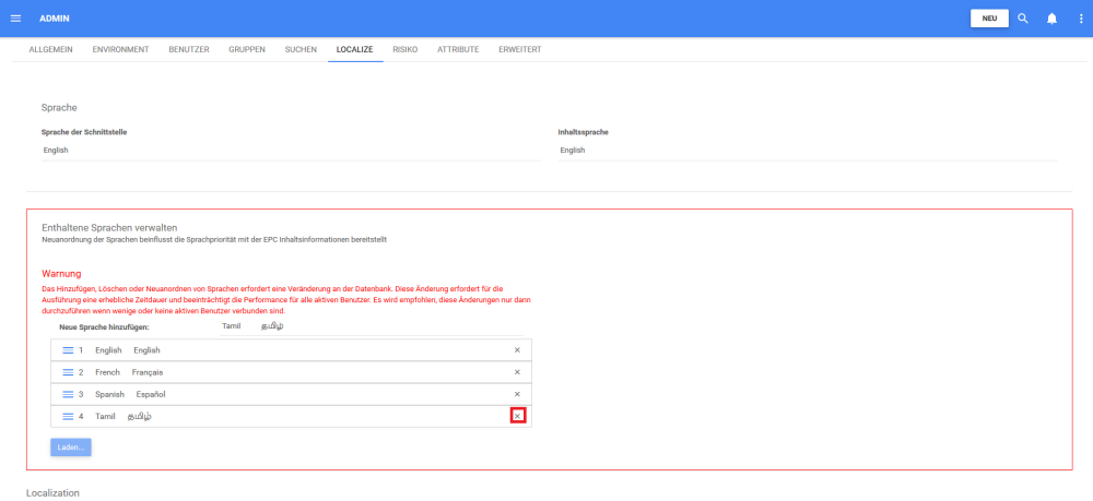 Durch das Entfernen von Sprachen wird die Möglichkeit des Benutzers, bestimmte Inhalte anzuzeigen, die in der gelöschten Sprache erstellt wurden, eingeschränkt. Während das Entfernen einer Sprache nicht den gesamten Inhalt löscht, wird die Fähigkeit des Benutzers, Informationen, die in dieser Sprache erstellt wurden, abzufragen, eingeschränkt.
