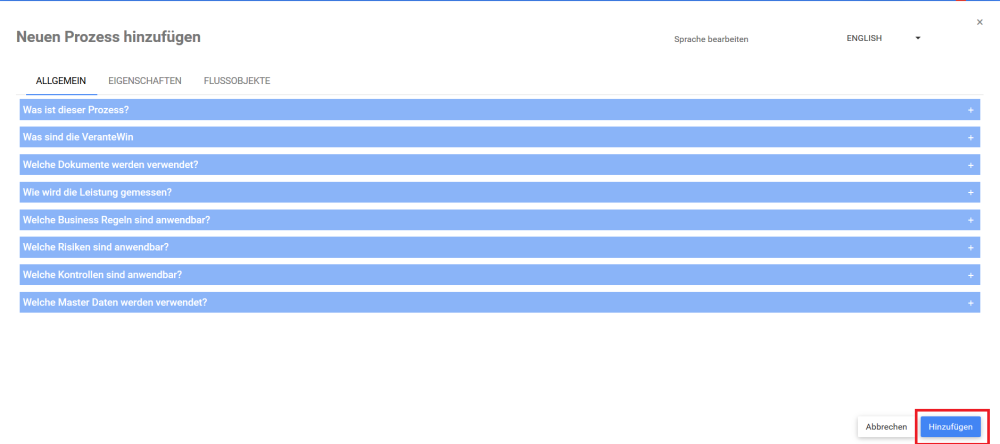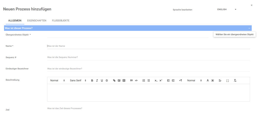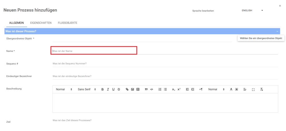 7. Es wird ein Fenster generiert, in dem Sie die Informationen über den neuen Prozess eingeben können.