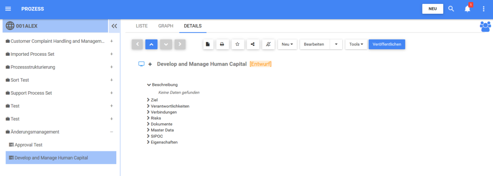 10. Der neue Prozess “Develop and Manage Human Capital” befindet sich nun in der Prozessbaumstruktur. Dieser Prozess ist derzeit ein Entwurf. Um zu erfahren, wie man Prozessobjekte veröffentlicht, klicken Sie hier.