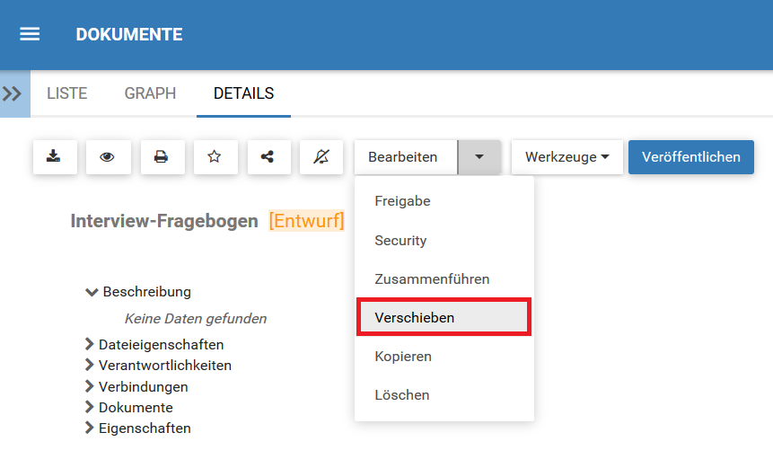 Um Dokumentobjekte zu verschieben, navigieren Sie zur Detailseite des Elements. Wählen Sie in der Dropdown-Liste “Bearbeiten” die Option “Verschieben”.