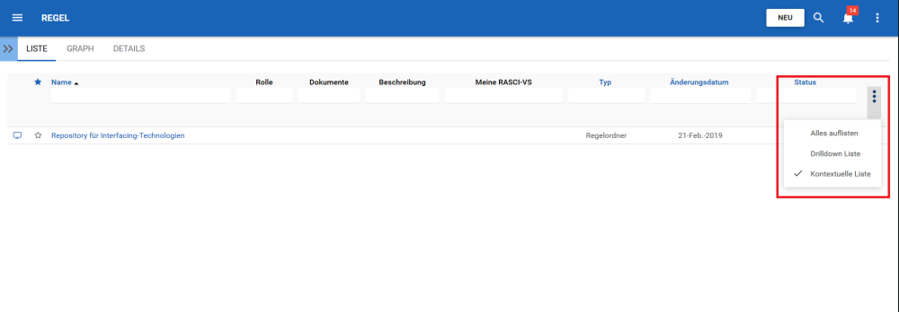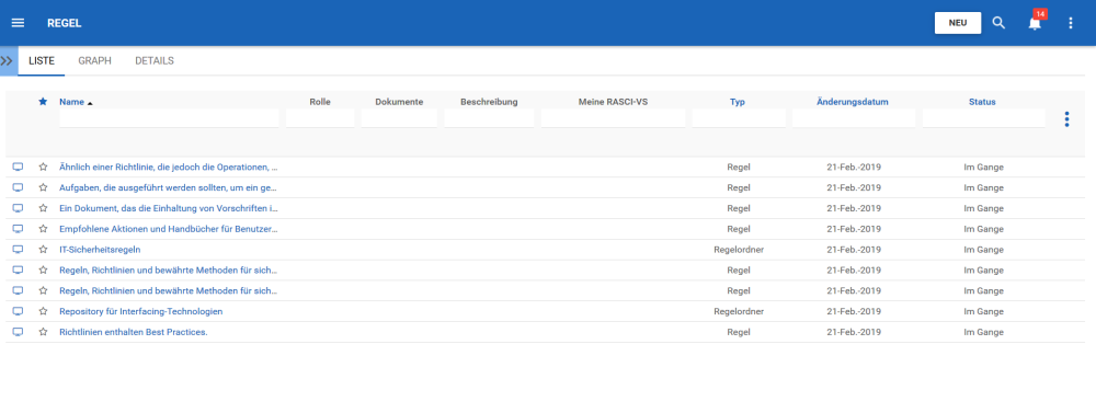 Die Listenansicht ermöglicht es Ihnen, alle Regelelemente zu sehen, auf die Sie Zugriff haben, einschließlich der spezifischen Details. Die Anzeige von Regelelementen in einer Liste ermöglicht es dem Benutzer, eine schnelle Übersicht über verschiedene Regelelemente zu erhalten, was die Navigation erleichtert.