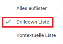 | Kontextuelle Liste | Eine Listenansicht, in der die 1-stufige Ebene unterhalb des ausgewählten Elements aufgelistet ist |