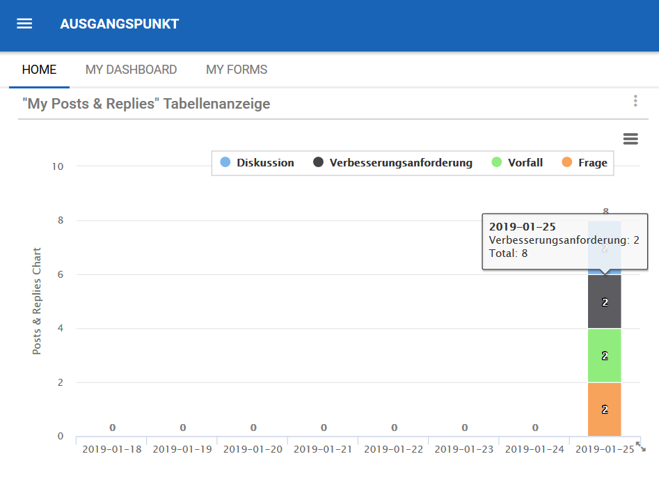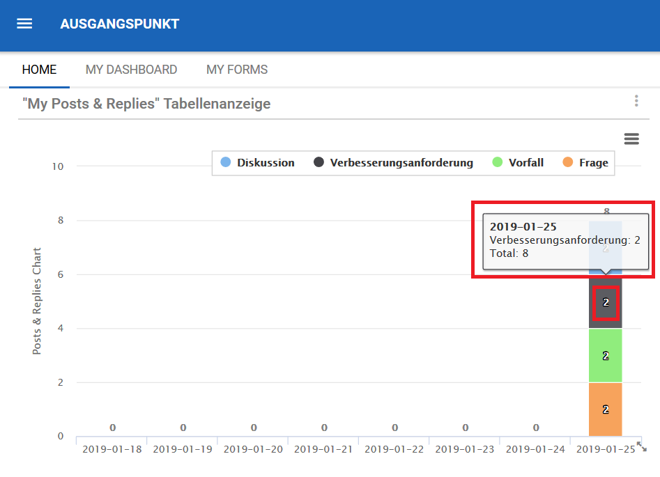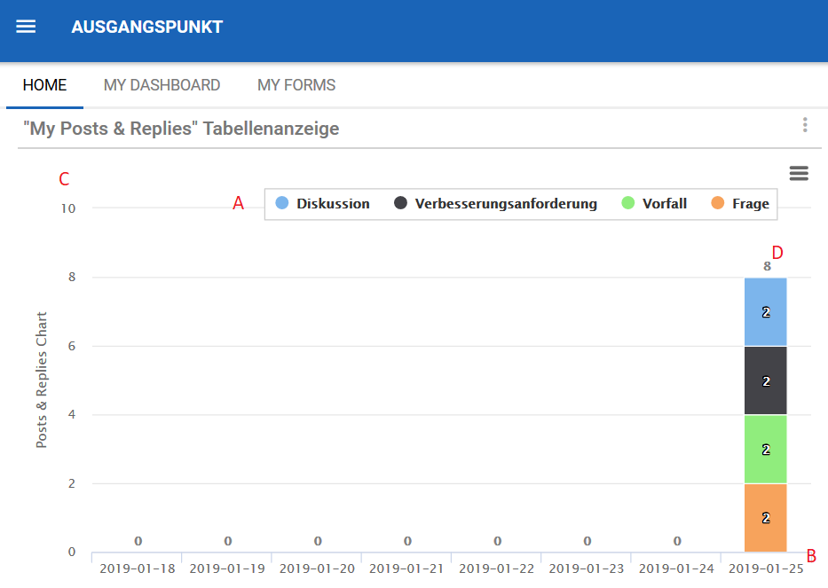 D. Column: Die Spalte zeigt die Anzahl der neuen Beiträge und Antworten für einen bestimmten Tag. Die Spalte ist in 4 verschiedene Abschnitte unterteilt. Jeder Abschnitt hat seine eigene Farbe und die Farbe bestimmt, ob es sich um eine Diskussion, einen Verbesserungsantrag, einen Vorfall oder eine Frage handelt.