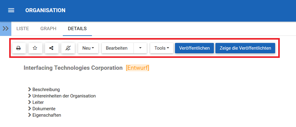 Benutzer können zwischen den Elementen über die Symbolleiste oben auf der Seite navigieren. Weitere Details finden Sie im Abschnitt Symbolleiste unten.