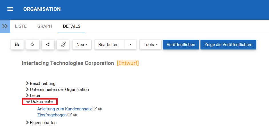 Den Benutzern wird ein Direktzugriffslink zur Verfügung gestellt, der in blau aufgeführt ist. Ein Klick auf den Namen führt einen Benutzer zur Seite mit den Dokumentdetails.