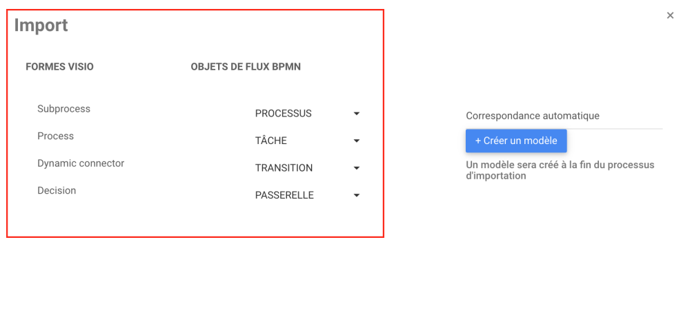 5. Lorsque vous êtes prêt, cliquez sur le bouton Prochain. Une fenêtre s’ouvre permettant à l’utilisateur de sélectionner les formes BPMN équivalentes à celles de Visio.