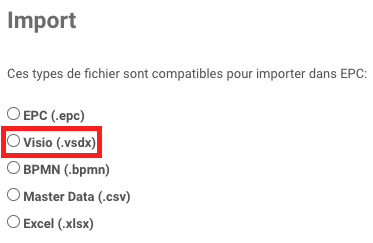 Suivez les étapes ci-dessous pour importer des données à partir d’un environnement EPC extérieur. Le format du fichier de données doit être .vsdx.