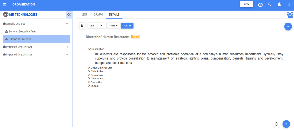 - Le nouveau rôle “Directeur des ressources humaines” est désormais dans l’arborescence de l’Organisation. Ce rôle est actuellement un brouillon. Pour savoir comment publier des objets d’organisation, cliquez ici