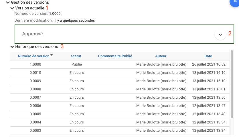 3.Historique des versions : Fournit des informations sur les versions précédentes du document. Comprend les versions majeures et mineures, le statut, l’auteur et la date. Notez que pour le module documents, vous pouvez télécharger les versions précédentes des documents. L’icône de téléchargement n’apparaîtra que si un nouveau document a été téléchargé pour cette version.