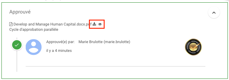 Pour voir le document approuvé, cliquez sur la flèche vers le bas. cliquez sur l’icône d’aperçu ou de téléchargement. Pour plus d’explications sur la prévisualisation des documents, cliquez ici