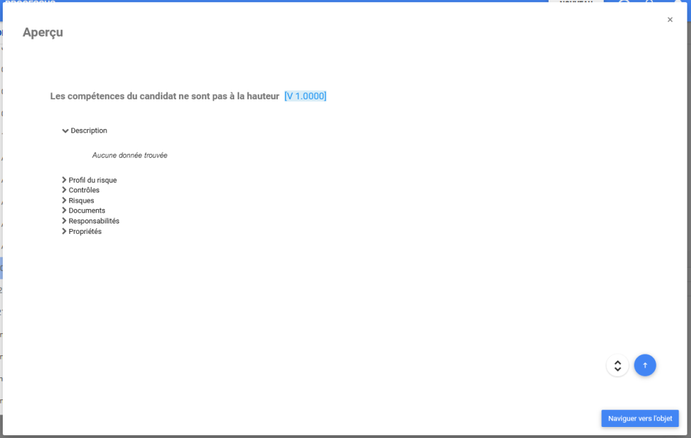 Les utilisateurs peuvent cliquer sur le nom de l’objet pour afficher ses détails dans une fenêtre contextuelle. Pour accéder à la page des détails de l’objet, cliquez sur Naviguer vers l’objet.