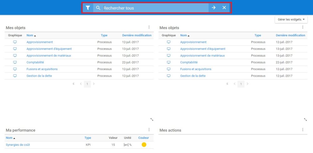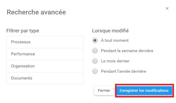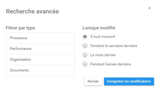 La recherche avancée permet aux utilisateurs de filtrer par type d’item et date modifié.
