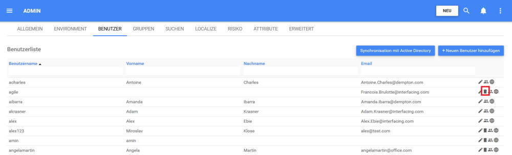 Auf der Registerkarte Umgebung können Systemadministratoren Benutzer löschen.
