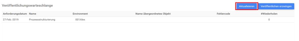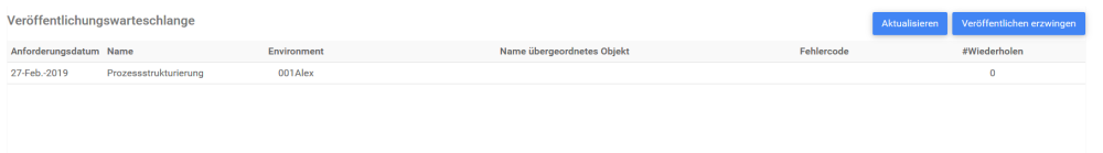 Die Publish Queue wird von Systemadministratoren verwendet, wenn viele Elemente gleichzeitig von einem oder mehreren Modeler-Benutzern veröffentlicht werden. Die Publish Queue wird auch von Systemadministratoren verwendet, wenn Modeler-Benutzer neue Versionen desselben Elements in schneller Folge veröffentlichen. Die in der Tabelle gefundenen Elemente sind die Elemente, die von Modeler-Benutzern zur Veröffentlichung auf der WebApp gesendet wurden. Da diese Aktion je nach Anzahl und Größe der Elemente einige Minuten dauern kann, kann der Sysem Admin die Liste Refresh und Force Publish neu erstellen.