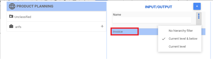 All inputs/outputs previously created will be displayed in the list section, as shown below. They can always be found quicker by having the list option set as “Current Level & Below”. It is also possible to filter the name of the input/output of interest.