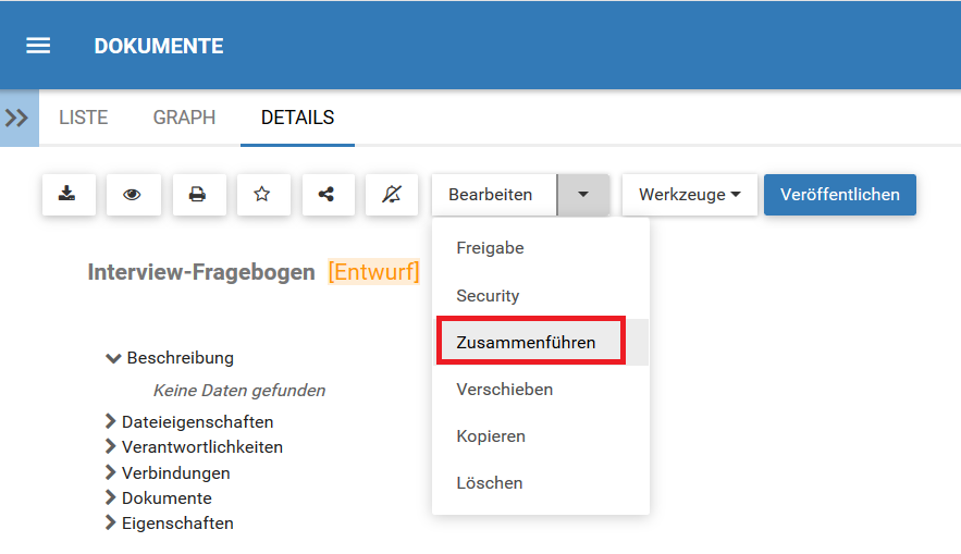 Benutzer finden diese Funktion auf der Detailseite der Elemente. Weitere Anweisungen zur Verwendung unserer *Zusammenführen*-Funktion finden Sie in der Arbeitsanweisung hier.