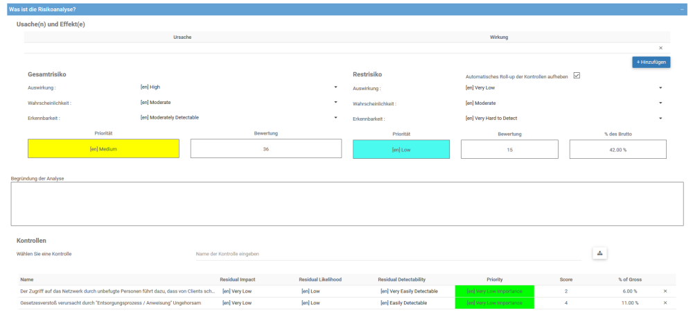 - Vom System generierte Kalkulation: Nachdem Sie die Werte für Ihren Bruttorisiko-Score ermittelt haben, wenden Sie Kontrollen an, mit denen Sie die Restwerte für Auswirkung, Wahrscheinlichkeit und Erkennbarkeit bestimmen können. Der EPC nimmt diese Restwerte und berechnet Ihre Restrisiko-Scores. Arbeitsanweisungen zur Anwendung von Kontrollen finden Sie im Abschnitt hier.