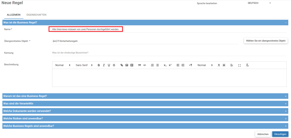 Für dieses Beispiel lautet der Name der Regel “Alle Interviews müssen von zwei Personen durchgeführt werden”.