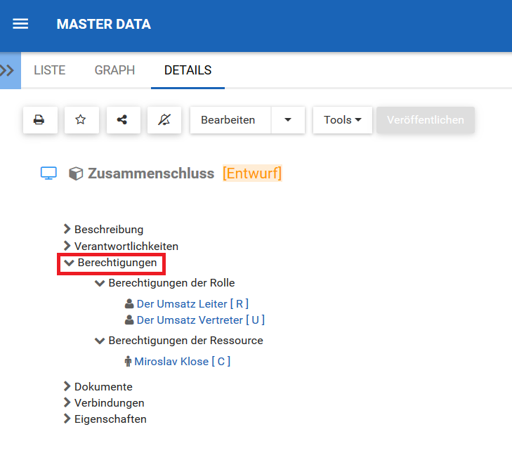 Der Abschnitt Berechtigung zeigt die Rollen an, die Berechtigungen für die Entität oder das Attribut haben, die Sie anzeigen. Der Benutzer kann sehen, welche CRUD-Funktion der Rolle zugewiesen wurde, entweder die Berechtigung zum Erstellen, Lesen, Aktualisieren und/oder Löschen.