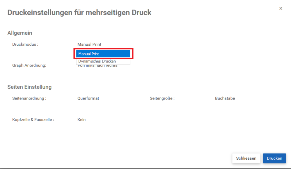 Benutzer können Prozesslandkarten mit den Funktionen für den manuellen Druck des EPC einfach drucken. Der manuelle Druck ermöglicht es Benutzern, ihre Prozesslandkarten neu zu organisieren und die gewünschten Inhalte für den Druck auszuwählen. Benutzer haben die Möglichkeit zu: