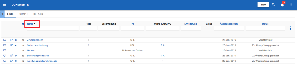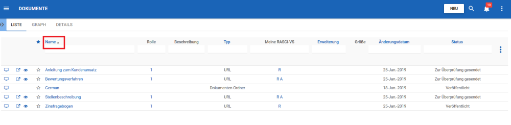 Die Sortierung ermöglicht es Benutzern, Dokumente anhand ausgewählter Kriterien zu klassifizieren. Sie können die Listenergebnisse für jeden Spaltentitel, der in BLAU geschrieben ist, sortieren.