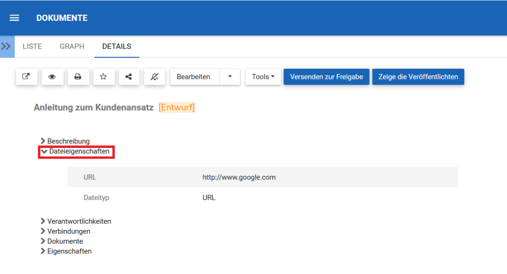 Der Abschnitt Dateidetails bietet dem Benutzer zusätzliche Informationen über ein Dokument, einschließlich Dateityp und -größe. Diese Informationen können für den Endbenutzer nützlich sein, um zu verstehen, ob ein Benutzer über die notwendigen Softwareanwendungen verfügt, um das betreffende Dokument anzuzeigen.