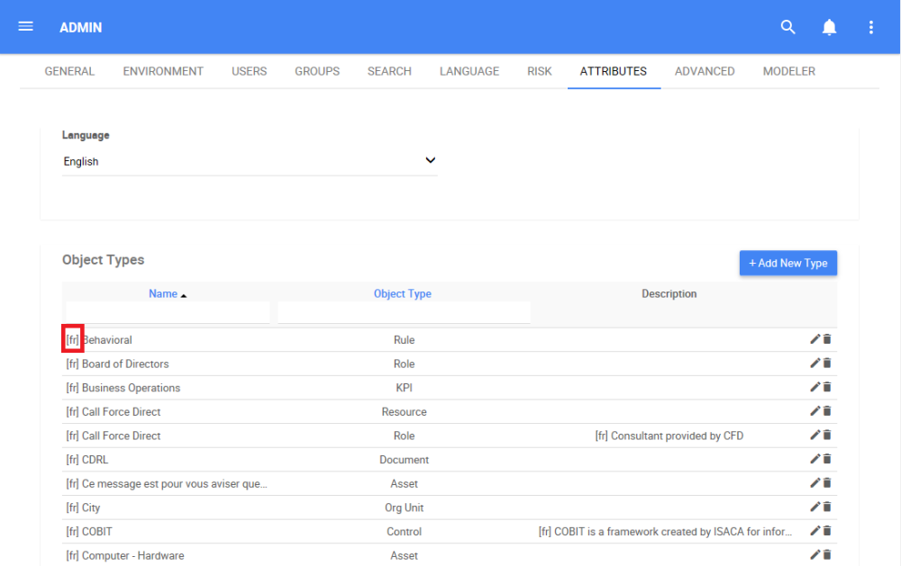 - When multiple content languages are available for the Object Type, the Category or the Attribute, a language abbreviate in brackets will appear next to the name of the item (e.g. French as [fr], English as [en], Spanish as [sp], etc.). For the following example, the content language chosen is English. There is a French translation of the Object Type; therefore, [fr] is displayed next to the name