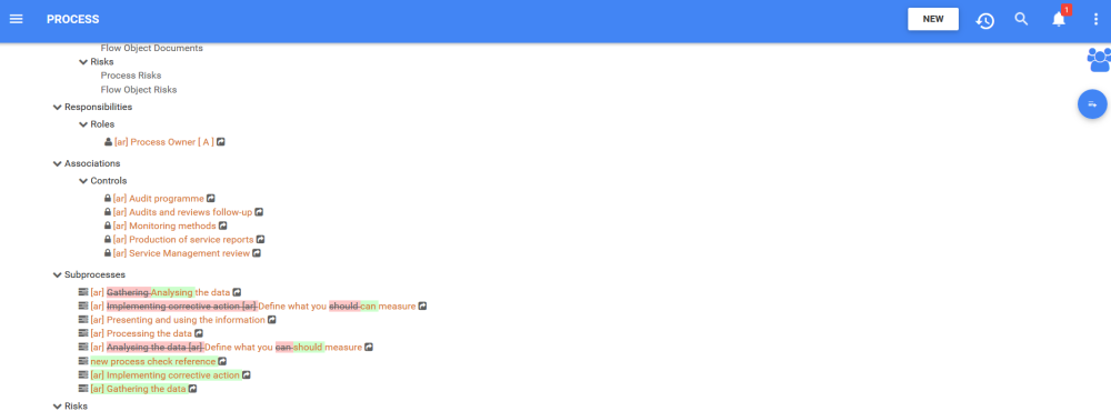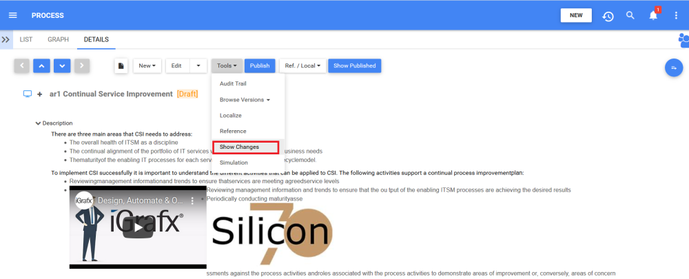 Users can use the “Show Changes” feature to compare the details page of the current version of an EPC object to the previously published version.