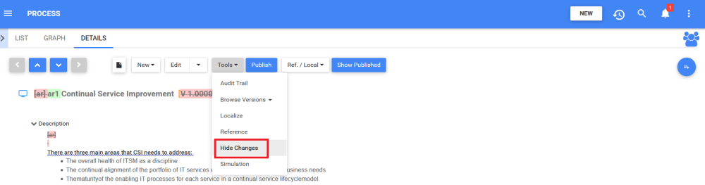 3. To exit the comparison, under Tools, click on Hide Changes