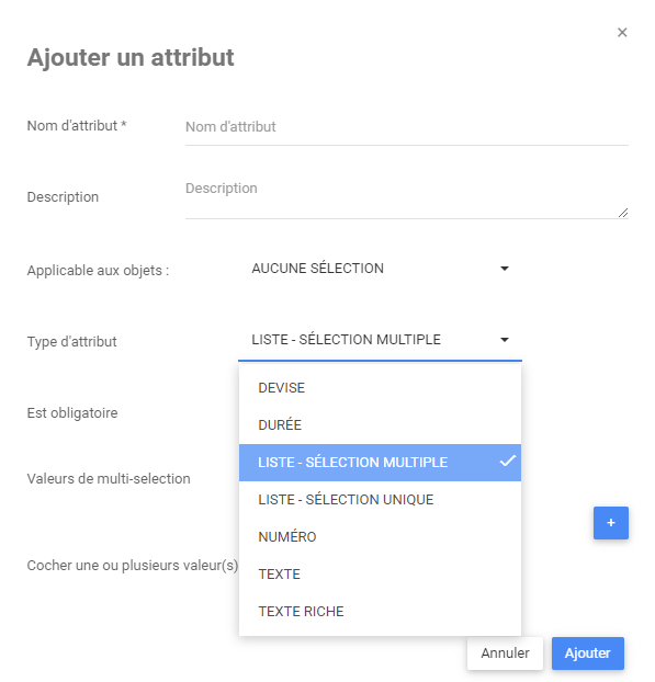Pour tous les types d’attributs, il est possible de sélectionner les objets auxquels l’attribut s’applique, en les sélectionnant dans la liste déroulante “Applicable aux objets”.