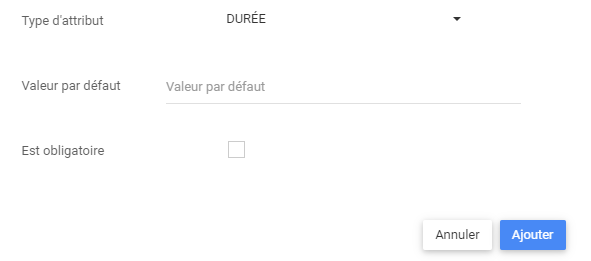 - Pour Durée, Numéro et Texte, les informations à ajouter sont la Valeur par défaut, et cochez la case «Est obligatoire» pour rendre le champ obligatoire pour les utilisateurs. La sélection de l’un de ces types d’attributs dépend du contenu de la valeur par défaut.