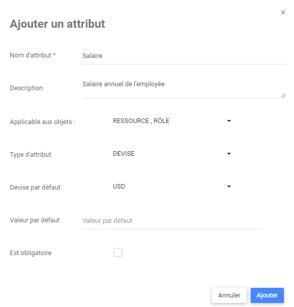- Pour Devise, les informations sont les mêmes que celles pour Durée / Nombre / Texte, mais avec l’ajout de l’option pour sélectionner la «Devise par défaut». Dans l’exemple ci-dessous, le nom de l’attribut est «Salary», il s’applique aux objets «Role, Resource» et il s’agit d’une devise USD.