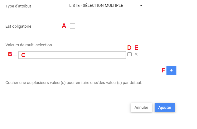 D- L’option pour sélectionner une valeur par défaut (pour la sélection simple et multiple), ou plusieurs valeurs par défaut (pour la sélection multiple)