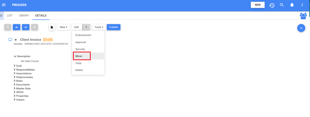 Pour déplacer des processus, accédez au graphique de la carte des processus ou à la page de détails. Dans la liste déroulante “Éditer”, sélectionnez “Déplacer”.