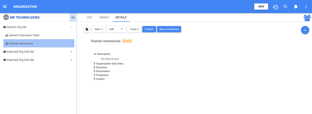 - La nouvelle unité organisationnelle “Ressources humaines” est maintenant dans l’arborescence de l’organisation. Cette unité organisationnelle est actuellement un “brouillon”: #404. Pour savoir comment publier des objets d’organisation, cliquez ici