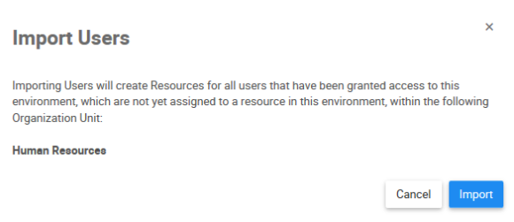 3. A window will be generated explaining you that all users that have been granted access to the environment will be imported as resources. Click on button