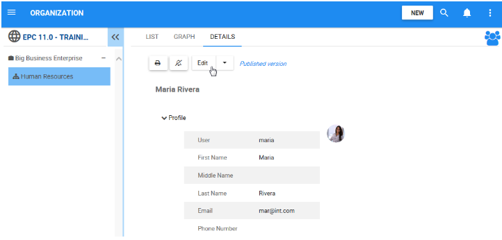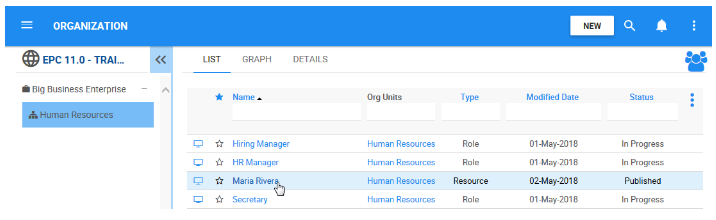 5. Now that your EPC user was successfully imported as a resource, let’s assign your resource to a role. Navigate to the List View of the “Human Resource” organization unit, and select your name, in this example, “Maria Rivera.”