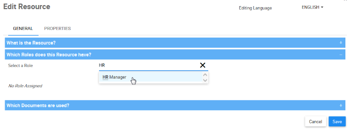 7. Under the “Which Roles does this Resource have?” type “HR Manager” and select it from the list. The role will now be on a table. Click on