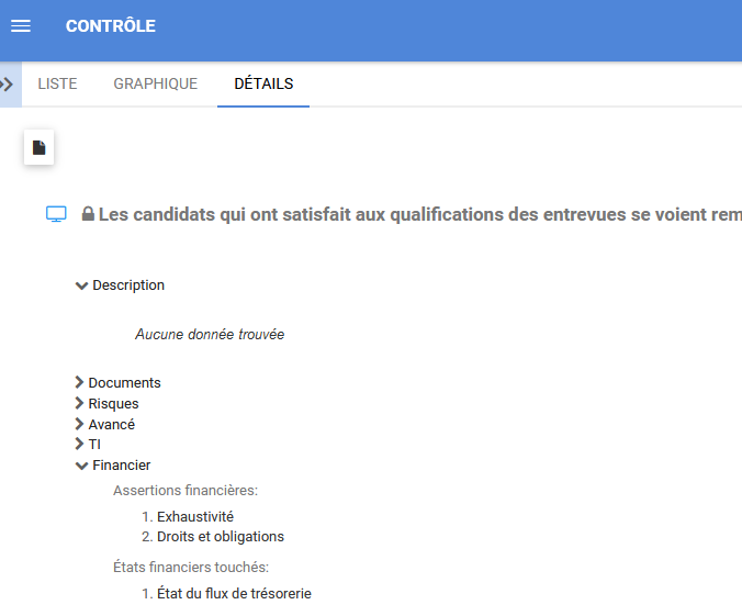 La section Finances affiche les assertions financières associées au contrôle et les états financiers qui sont touchés par le contrôle.