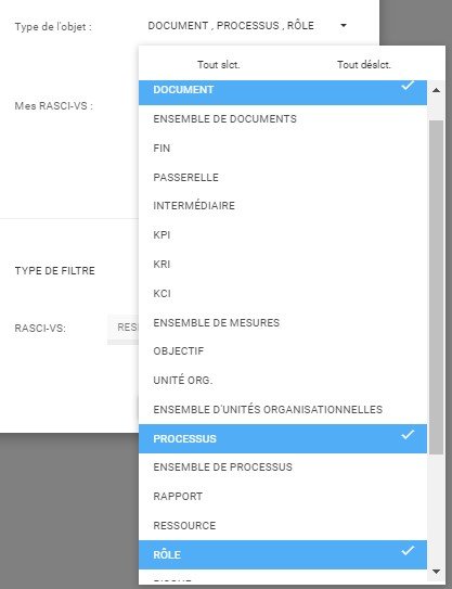 Pour illustrer ce concept, nous utiliserons les filtres “Mon objet type” et “Filtre pour mes abonnements”. Les “Types d’objets” sélectionnés seront Documents, Processus et Rôles.