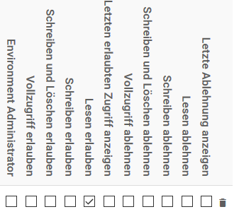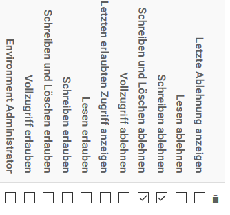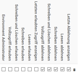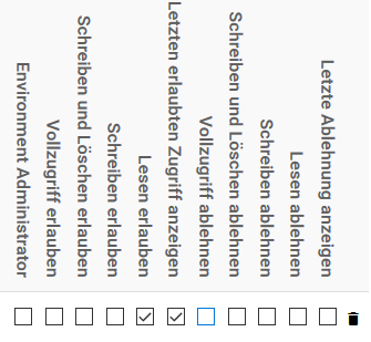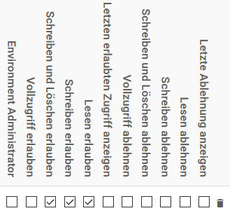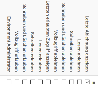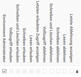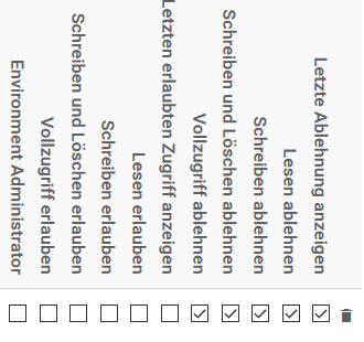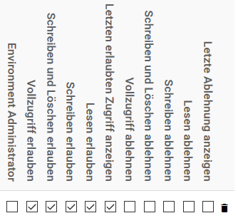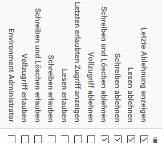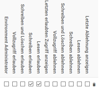 | Schreiben Löschen Verweigern | Dem Benutzer wird das Schreiben und Löschen in der Umgebung verweigert |