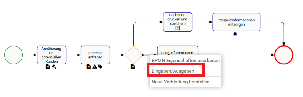 Ein- und Ausgänge definieren den Arbeitsablauf zwischen den Formen innerhalb eines Prozesses. Sie stellen die für den Beginn einer Aktivität erforderlichen Inputs und die nach Abschluss der Aktivität erzeugten Outputs dar.