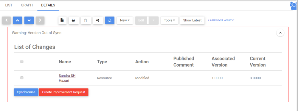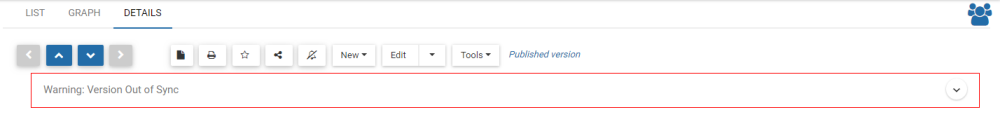 The box contains actions that can be done on the Out of Sync version. It will be removed from the details page after a new Draft version is included.