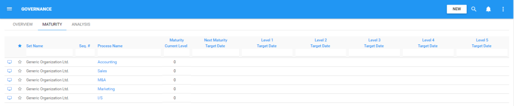 From the Maturity tab of Governance, you can edit and analyze all Process Maturity information.