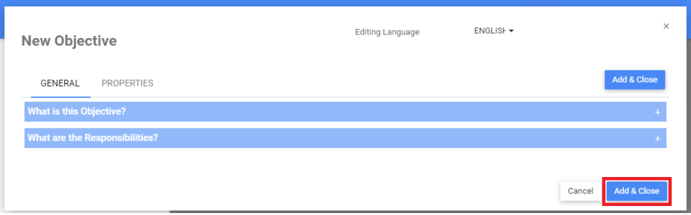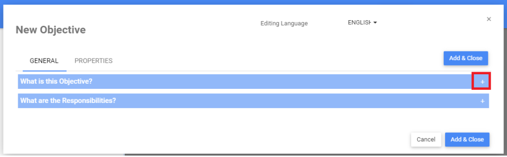 icons to expand and hide the different sections within each tab of the New Objective Window. Input the right information about the Objective in each section.