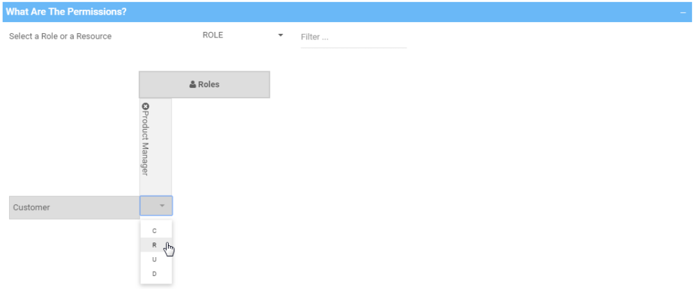 Web Modelers can assign the Roles or Resources that have permissions to access Attributes. The type of association can be further specified using the Create, Read, Update, Delete (CRUD) options.