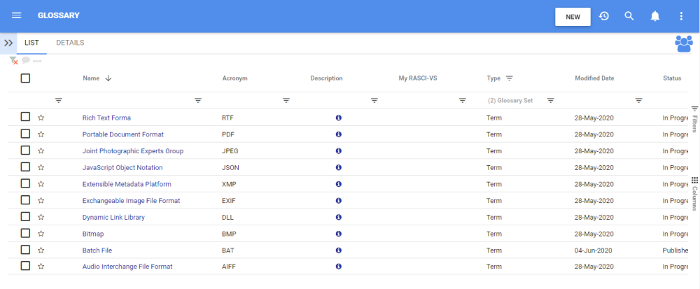 List view allows you to see all terms that you have access to, including the specific details within them. Viewing terms in a list allows users to have a quick view of various definitions and acronyms, facilitating navigation.