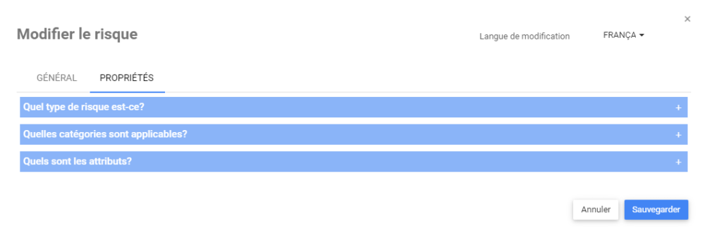 L’onglet Propriétés contient des sections pour le type, les catégories applicables et les attributs.
