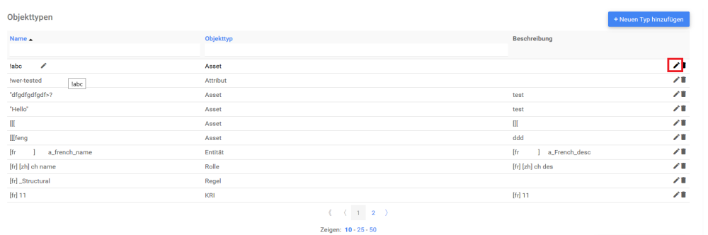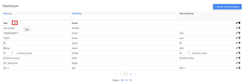 In-Line-Bearbeitungen können durchgeführt werden, indem der Name des Elements direkt in der Objekttypliste ausgewählt wird. Klicken Sie einfach auf den Namen, den Sie bearbeiten möchten und geben Sie den bearbeiteten Namen ein.