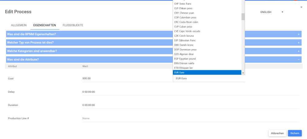 1. Es wird ein Dropdown-Menü generiert. Wählen Sie die Währung für die Kosten des Prozesses aus.